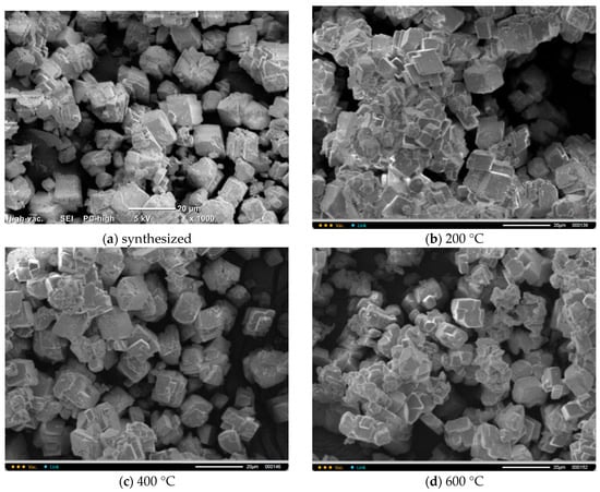 Figure 7 shows micrographs of CO3 powders after heat treatment for 2 h at various temperatures in the range of 200–600 °C. The particle size and shape of the powder particles after heat treatment did not significantly differ from the particle size and shape of the synthesized powder. It is difficult to detect particles with dimensions less than 2 mm and more than 20 mm in the micrographs.