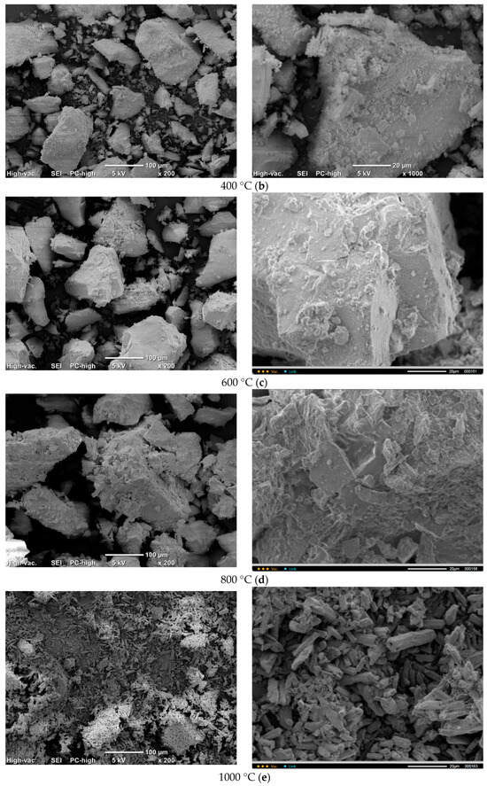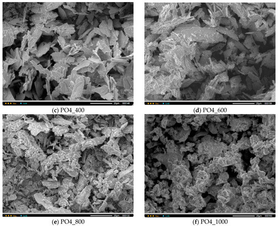 Figure 9 shows micrographs of PO4 powders after thermal treatment for 2 h at various temperatures in the range of 200–1000 °C. The particle size and shape of the powder particles after heat treatment at 200 and 400 °C practically do not differ from the particle size and shape of the synthesized powder. After heat treatment in the range of 600–1000 °C, as the temperature increases, the powder particles lose their lamellar morphology more and more. And after heat treatment at 1000 °C, the PO4_1000 powder is composed of conglomerates 5–20 microns in size, consisting of particles 1–3 microns in size, sintered together.