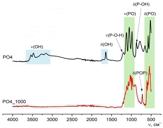 Figure 10. FTIR spectra of synthesized PO4 powder and PO4_1000 powder after heat treatment at 1000 °C.