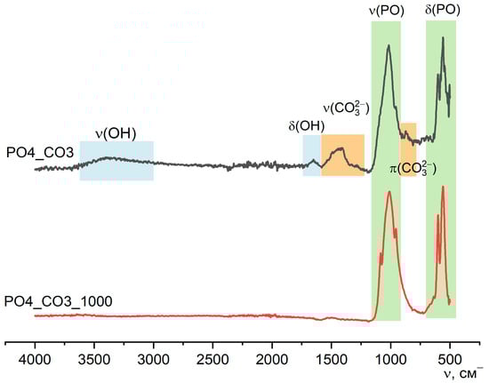 Figure 13 shows the FTIR spectroscopy data for PO4_CO3 powder after synthesis and after heat treatment at 1000 °C. In the spectrum of the PO4_CO3_1000 powder, there are no peaks that could be attributed to ν(OH), ν(CO32−), or π(CO32−). The FTIR spectrum for the PO4_CO3_1000 powder corresponds to the reference data for chlorapatite (SpectraBase Compound ID KKRjtSFM3Pp, https://spectrabase.com/spectrum/KKRjtSFM3Pp (accessed on 23 August 2025)).