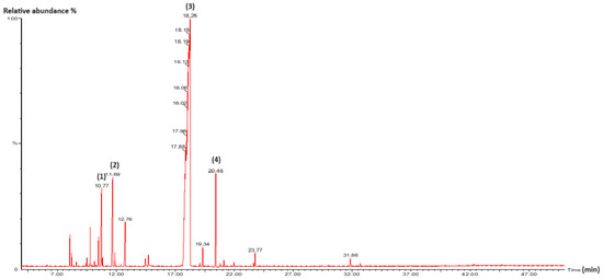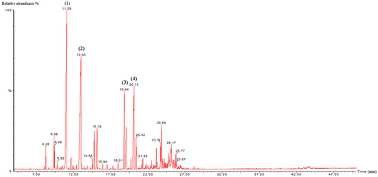 GC/MS chromatogram of L. nobilis EO. (1): Eucalyptol; (2): Linalool; (3): α-Terpinyl acetate; (4): Methyl eugenol. Detector type: mass spectrometry (MS).