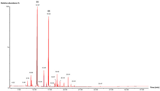 GC/MS chromatogram of M. piperita EO. (1): Linalool; (2): Linalyl acetate. Detector type: mass spectrometry (MS).