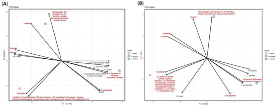 Principal component analysis of chemical and antibacterial and antifungal activity of L. nobilis, T. capitata, and M. piperita EOs. (A): Bacterial strains, (B): Candida strains.