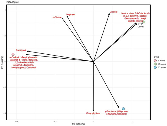 Principal component analysis of chemical and antioxidant activity of L. nobilis, T. capitata, and M. piperita EOs.