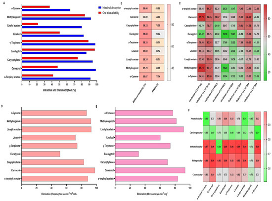 Predictive results of the absorption, distribution, and Elimination of the major compounds of L. nobilis, T. capitata, and M. piperita EOs. (A): intestinal absorption (%); oral bioavailability: (B): Distribution; (C): CYP Enzyme Interactions; (D): elimination (hepatocytes); (E): elimination (microsome); (F): Toxicity Profile.