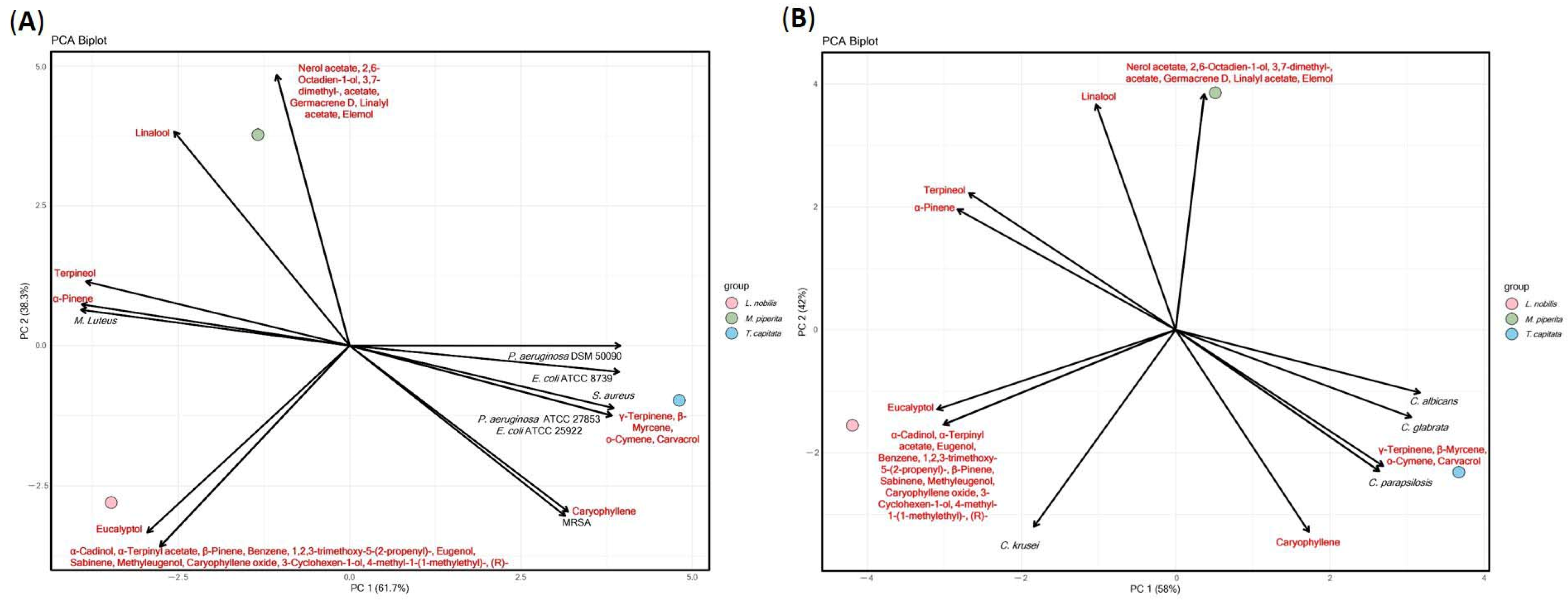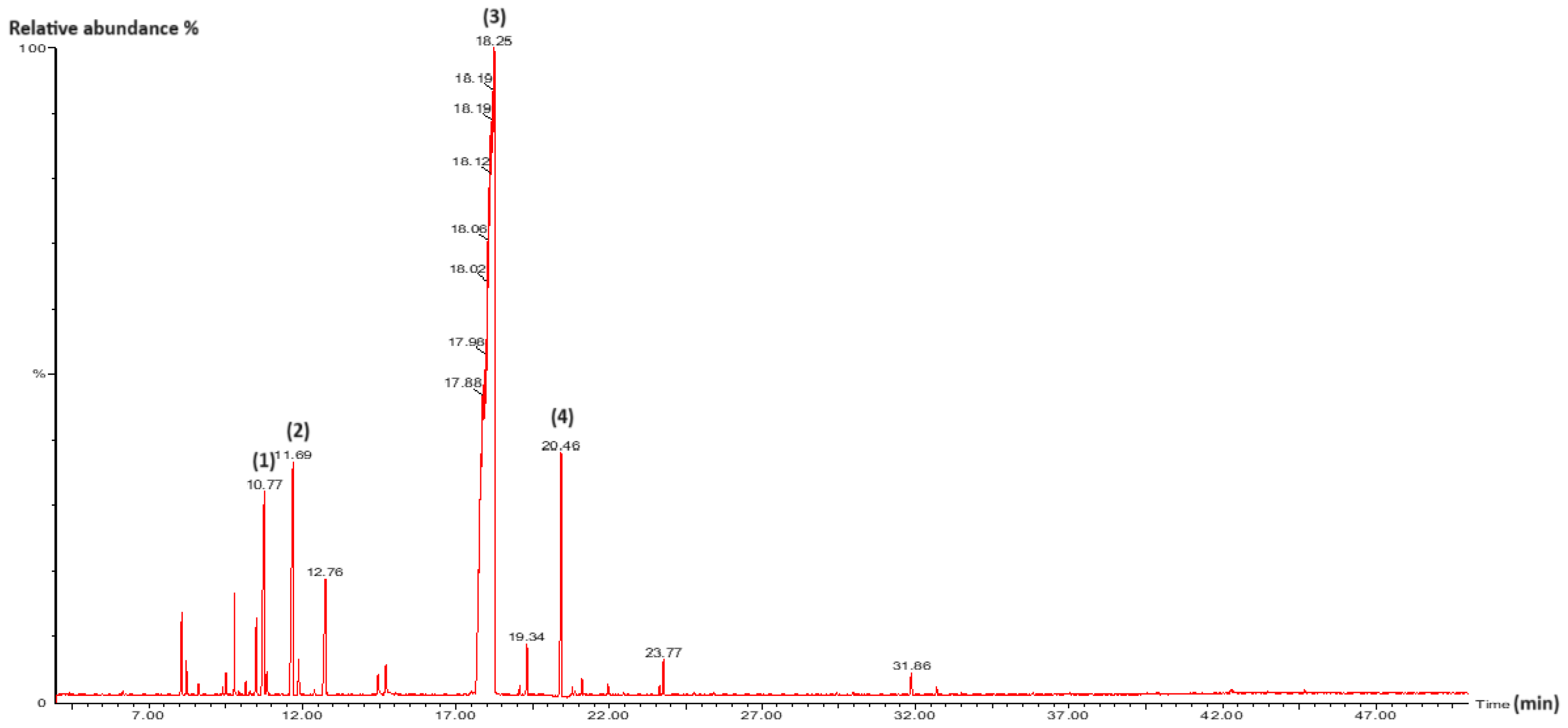 2.2. Essential Oils Characterization by Gas Chromatography/Mass Spectrometry (GC/MS)