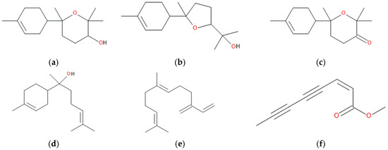 Bioactive compounds from the two chamomile essential oils. (a) Bisabolol oxide A; (b) bisabolol oxide B; (c) bisabolone oxide A; (d) α-bisabolol; (e) ß-farnesene; (f) lachnophyllum ester, cis.