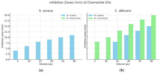 Inhibition zones (mm) produced by essential oils of M. chamomilla and T. inodorum against Staphylococcus aureus ATCC 25923 and Candida albicans ATCC 10231. (a) M. chamomilla; (b) T. inodorum.
