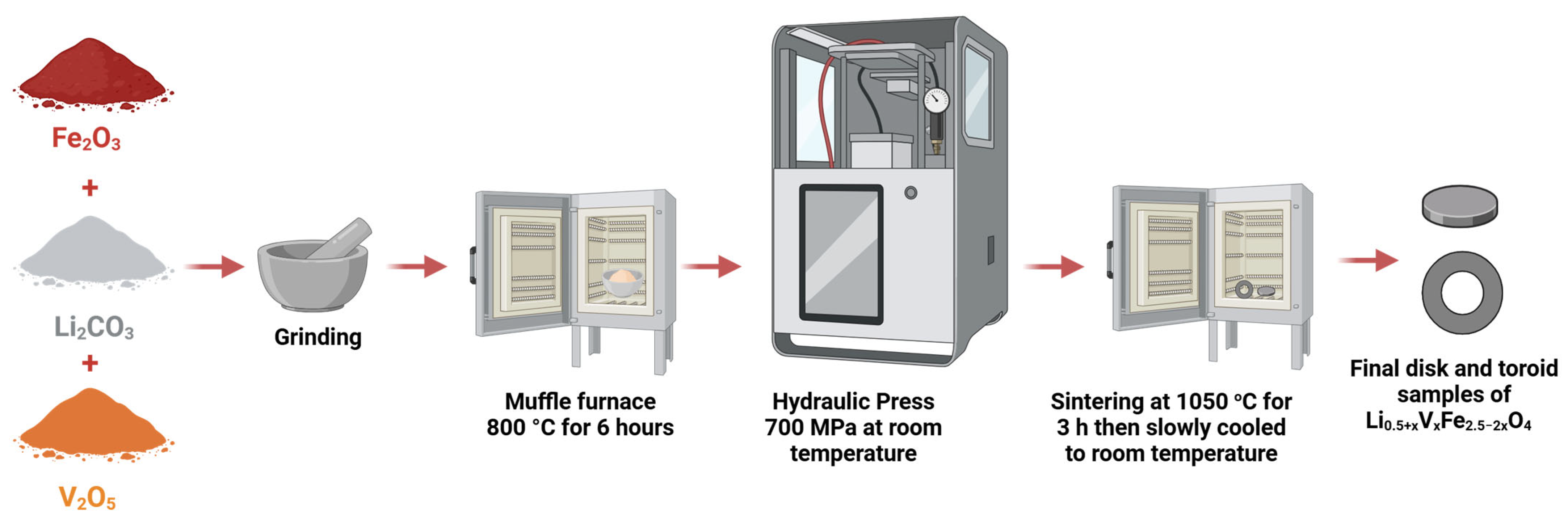 - Yang, Y.C.; Zhong, X.C.; Long, K.W.; Liu, Z.W.; Ramanujan, R.V. Effective Reduction of Sintering Temperature for High-Performance Mn-Zn Ferrites via Synergistic Doping of V2O5 and Al2O3 Sintering Aids. Ceram. Int. 2025, 51, 41430–41444. [Google Scholar] [CrossRef]