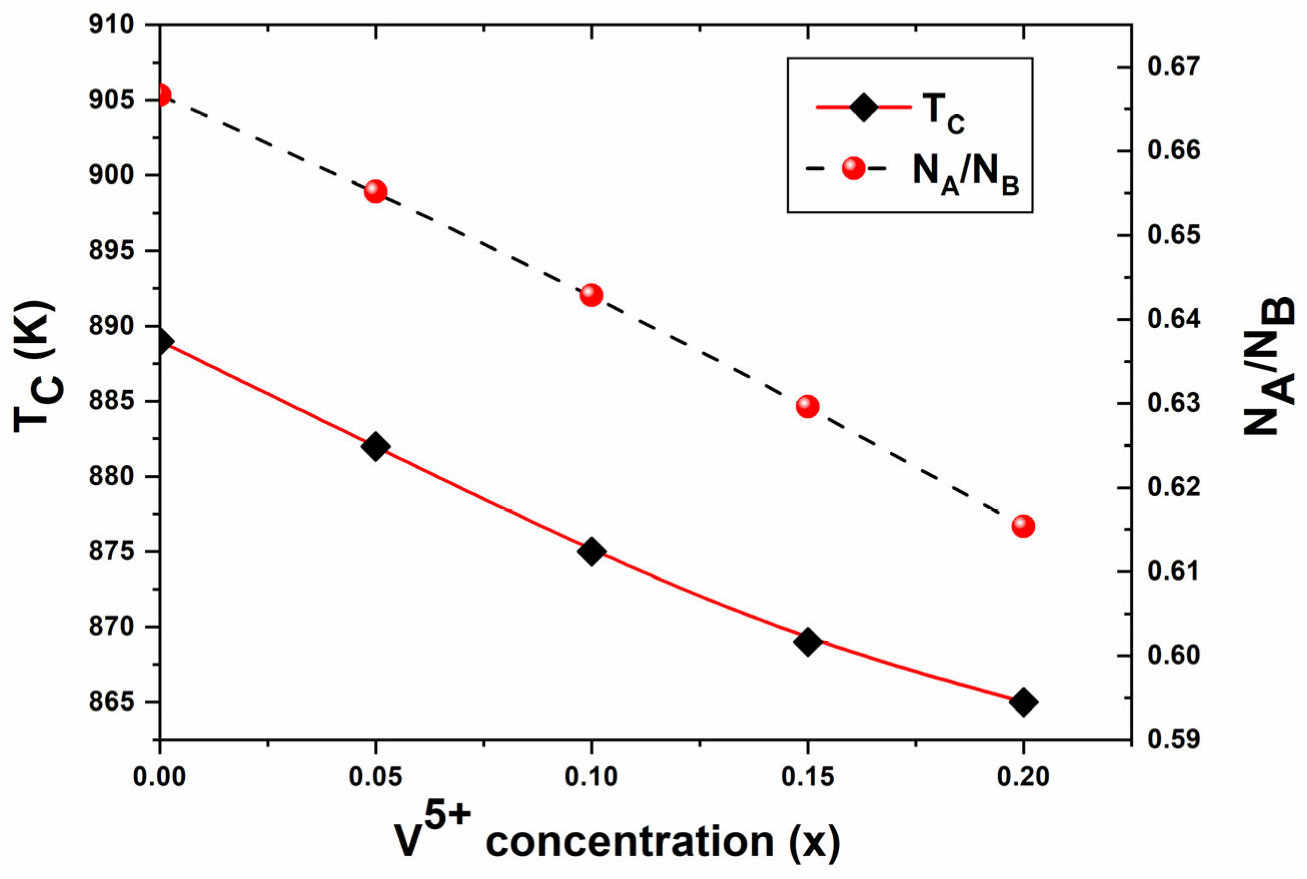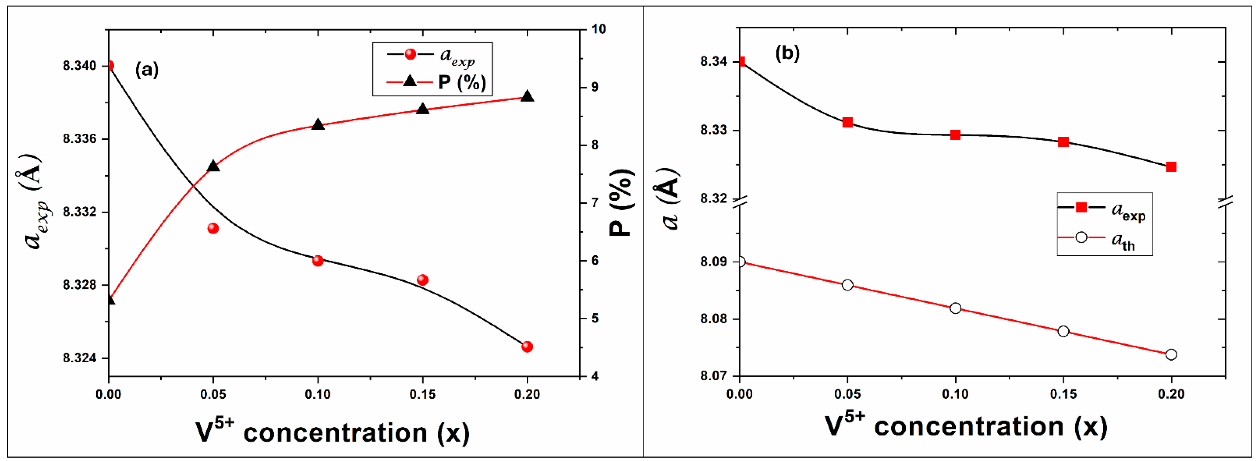 - El-naggar, A.M.; Mohamed, M.B.; Aldhafiri, A.M.; Heiba, Z.K. Effect of Vacancies and Vanadium Doping on the Structural and Magnetic Properties of Nano LiFe2.5O4. J. Mater. Res. Technol. 2020, 9, 16435–16444. [Google Scholar] [CrossRef]