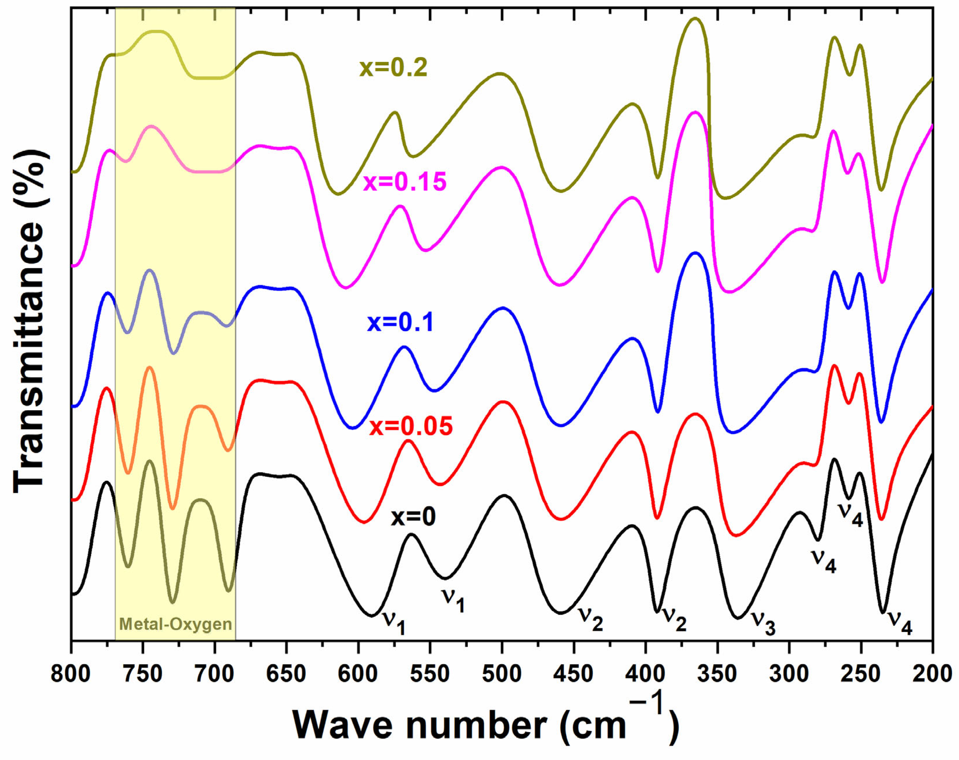 - Mazen, S.A.; Abdallah, M.H.; Nakhla, R.I.; Zaki, H.M.; Metawe, F. X-Ray Analysis and IR Absorption Spectra of Li-Ge Ferrite. Mater. Chem. Phys. 1993, 34, 35–40. [Google Scholar] [CrossRef]