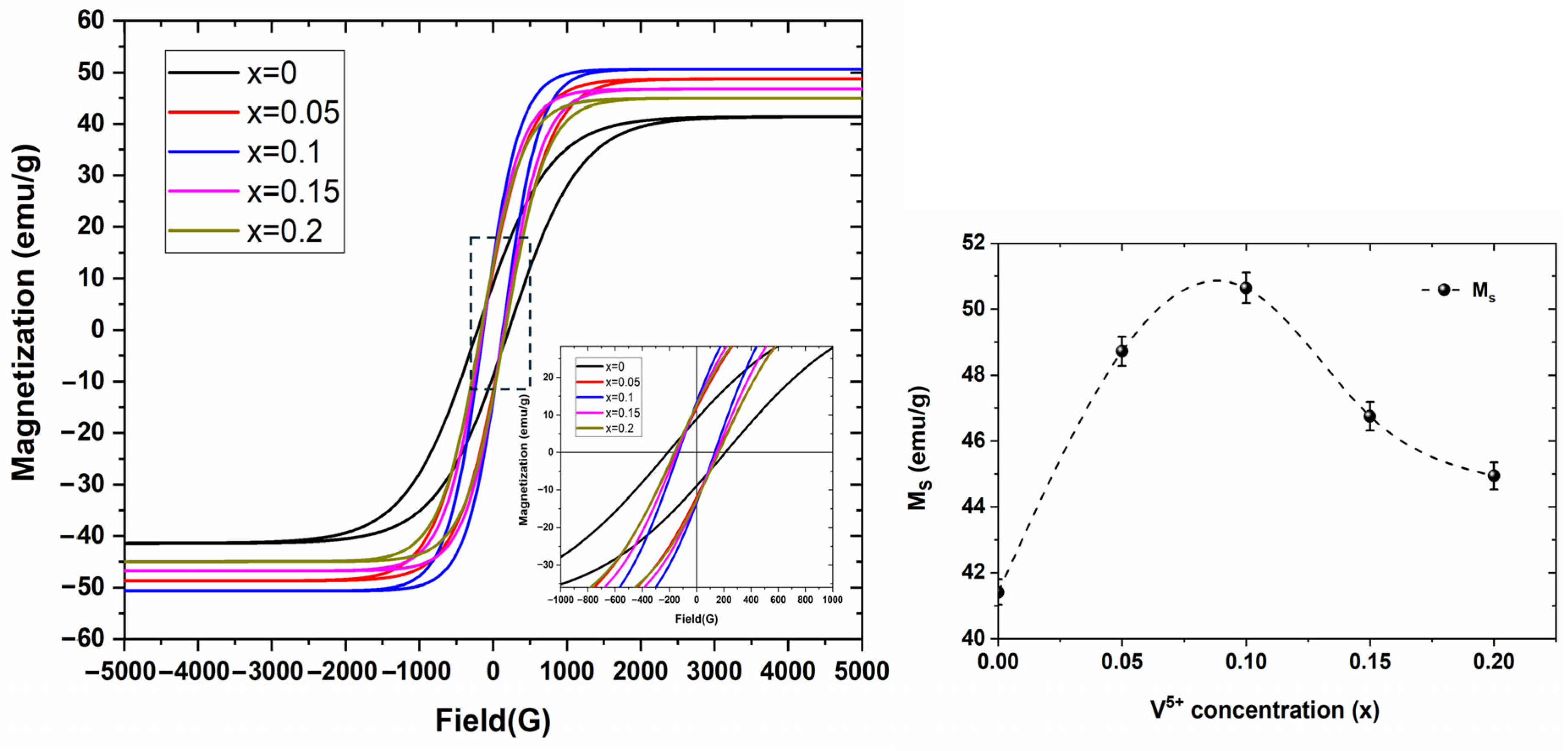 - Malathi, S.; Sridhar, B.; Wayessa, S.G. A Study of Lithium Ferrite and Vanadium-Doped Lithium Ferrite Nanoparticles Based on the Structural, Optical, and Magnetic Properties. J. Nanomater. 2023, 2023, 6752950. [Google Scholar] [CrossRef]