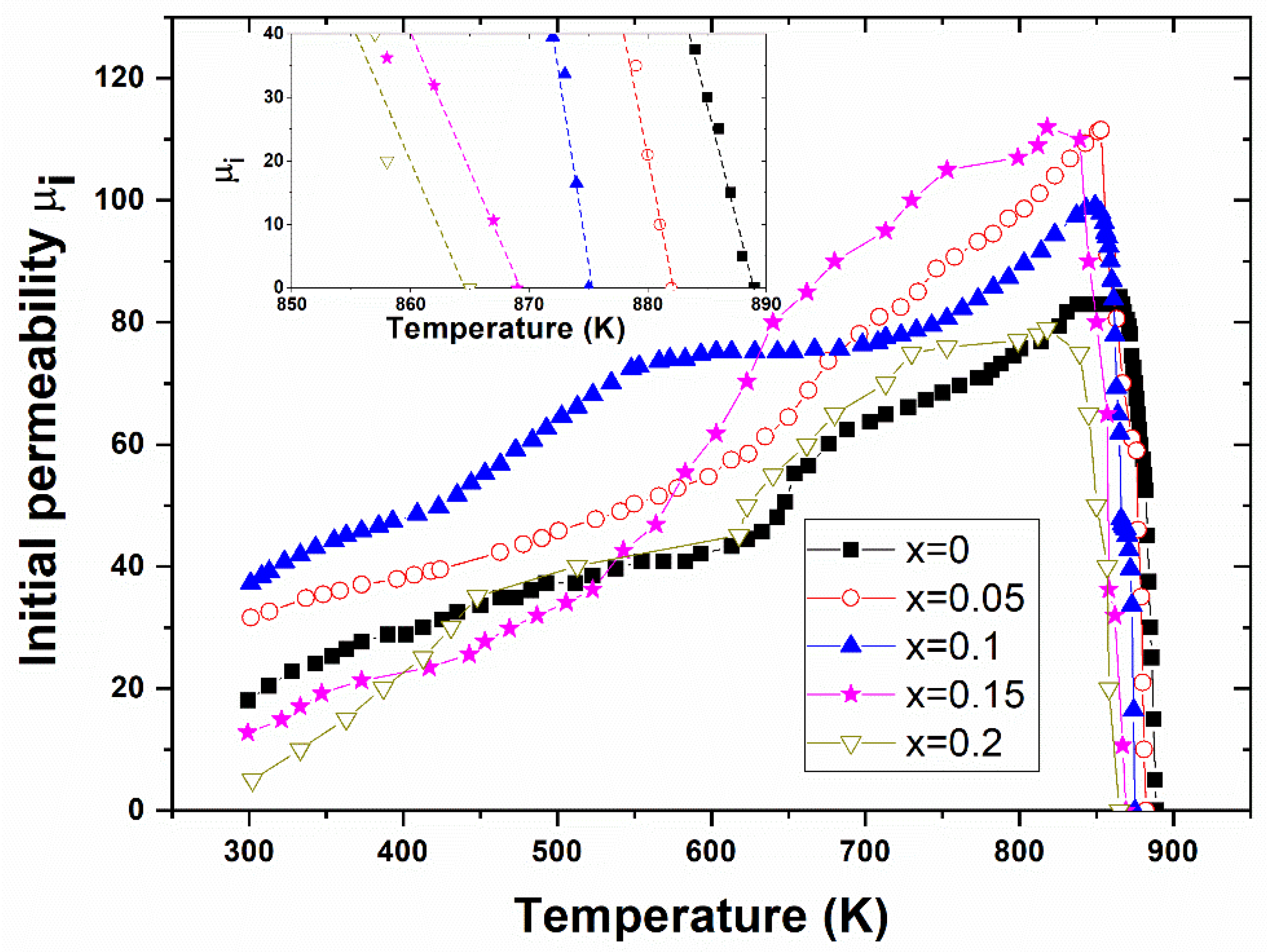 | x | Ms (emu/g) [±0.1] | Hc (G) [±0.05] | Br (emu/g) [±0.1] | M (g) [±0.1] | Ms (μB) [exp.] | Mag. Mom. (μB) [calc.] | ΘYK (°) | Initial Permeability ) | Tc (K) [±2] |