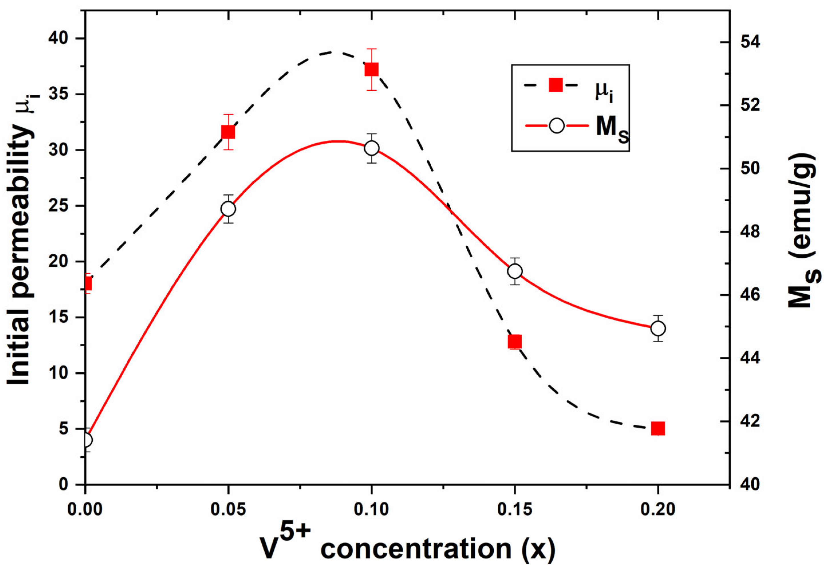 - Hu, D.; Zhao, F.; Miao, L.; Zhang, Z.; Wang, Y.; Cheng, H.; Han, Y.; Tian, M.; Gu, H.; Ma, R. Magnetic Properties and Microstructures of a Ni-Zn Ferrite Ceramics Co-Doped with V2O5 and MnCO3. Ceram. Int. 2019, 45, 10028–10034. [Google Scholar] [CrossRef]