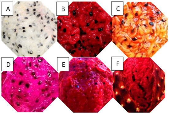 The results of this investigation for the red fruits were less than those found in S. stellatus fruits (16.52 mg/100 g of betaxanthins, 22.58 mg/100 g of betacyanins, and 50.38 mg/100 g of total betalains) [35]. On the other hand, reported 41.68 and 25.80 mg of total betalains in red and S. griseus orange fruits, respectively [33], and found 10.3 mg of betacyanins per 100 g of fresh pulp in red-fleshed Hylocereus spp., fruits [36]. However, the values obtained in the present study are similar to those reported for S. queretaroensis fruits [7]. It is important to remember that differences in betalain content are primarily due to the type of fruit and the species, which exhibit distinct nutritional and bioactive compound profiles.