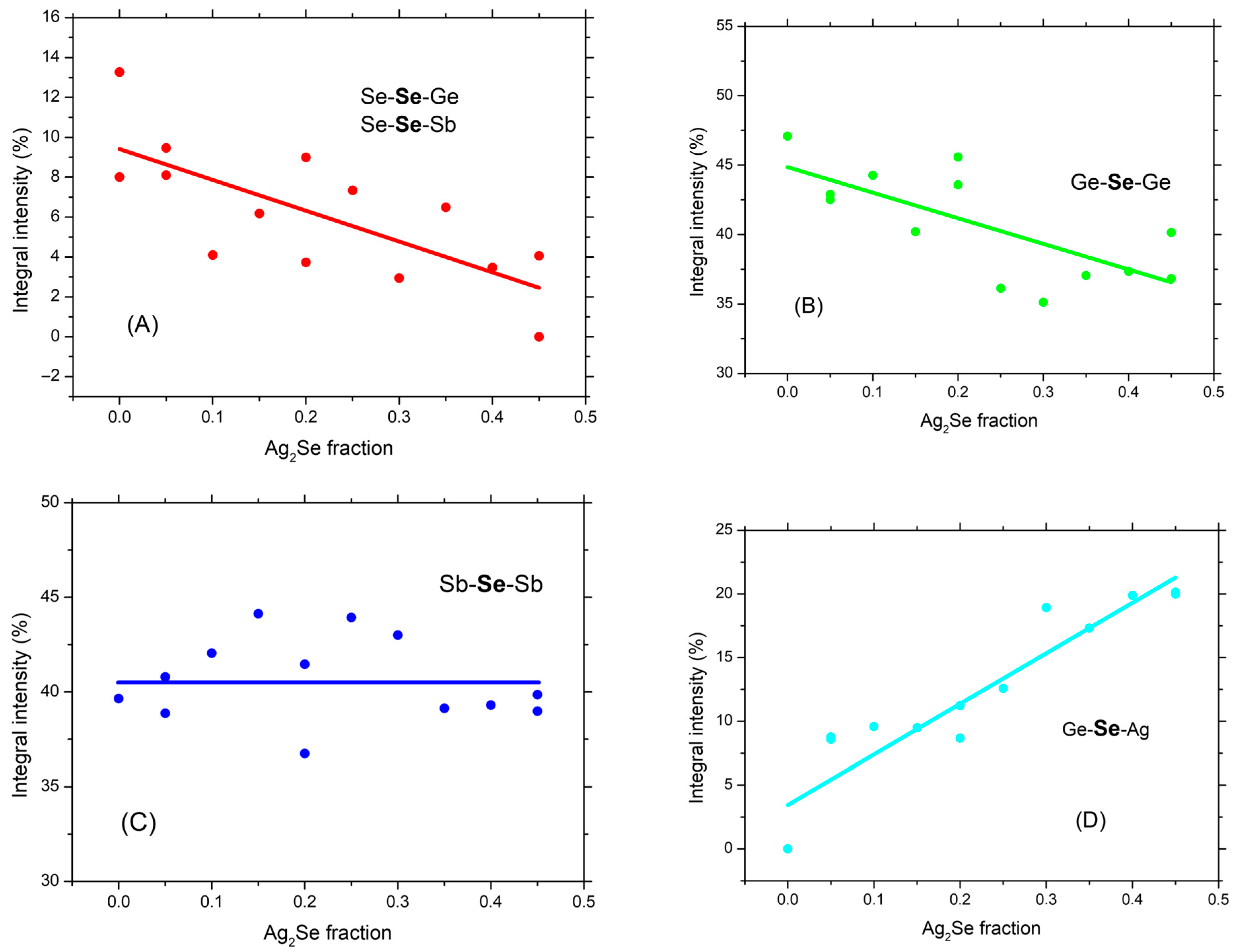 - Dejus, R.J.; Susman, S.; Volin, K.J.; Montague, D.G.; Price, D.L. Structure of vitreous Ag-Ge-Se. J. Non-Cryst. Solids 1992, 143, 162–180. [Google Scholar] [CrossRef]