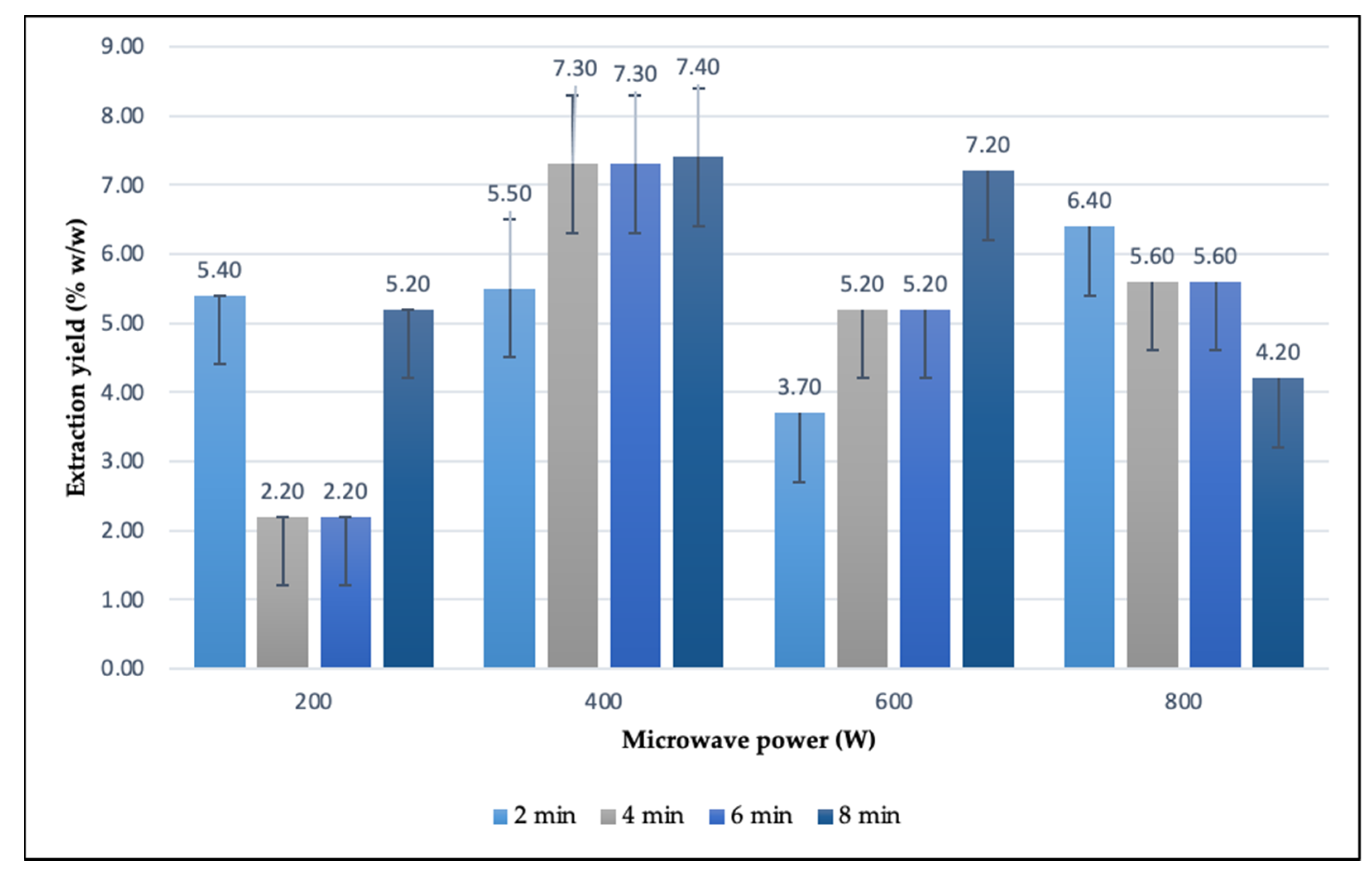 S. dumetorum leaf extract ranged from 2.20% to 7.50% across the tested microwave-assisted extraction conditions. At a constant microwave power of 200 W, the yield varied between 2.20% and 5.40%, with the highest value observed at 2 min (5.40%) and the lowest at 4 min (2.20%). At 400 W, the yield ranged from 5.50% to 7.40%. The maximum yield (7.40%) was obtained at 8 min, while the minimum (5.50%) was recorded at 2 min. For 600 W, yields varied between 3.70% and 7.50%. The highest yield (7.50%) was achieved at 6 min, whereas the lowest (3.70%) was observed at 2 min. At the highest power level of 800 W, extraction yield ranged from 3.80% to 6.40%. The maximum yield (6.40%) occurred at 2 min, and the minimum (3.80%) at 6 min. Across all experiments, the highest overall yield (7.50%) was recorded under the condition of 600 W and 6 min.