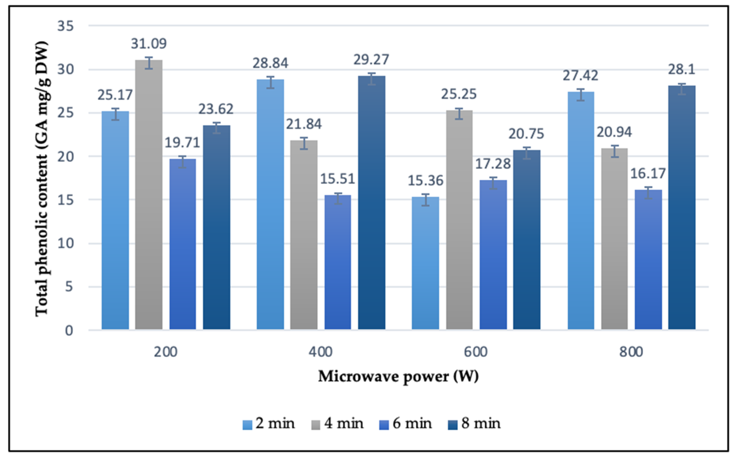 S. dumetorum leaf extract ranged from 15.36 to 31.09 mg GAE/g DW across the tested microwave-assisted extraction conditions. Under a microwave power of 200 W, TPC values fluctuated between 19.71 and 31.09 mg GAE/g DW. The highest concentration, 31.09 mg GAE/g DW, was obtained after 4 min of extraction, whereas the lowest, 19.71 mg GAE/g DW, was recorded after 6 min. At 400 W, TPC ranged from 15.51 to 29.27 mg GAE/g DW, with the maximum observed at 8 min, and the minimum at 6 min. When the power was increased to 600 W, the phenolic content varied between 15.36 and 25.25 mg GAE/g DW; the highest value was achieved at 4 min, while the lowest was measured at 2 min. In the case of 800 W, TPC values were between 16.17 and 28.10 mg GAE/g DW, peaking after 8 min and dropping to the lowest point at 6 min. Among all tested conditions, the greatest TPC (31.09 mg GAE/g DW) was reached under the combination of 200 W and 4 min of extraction.