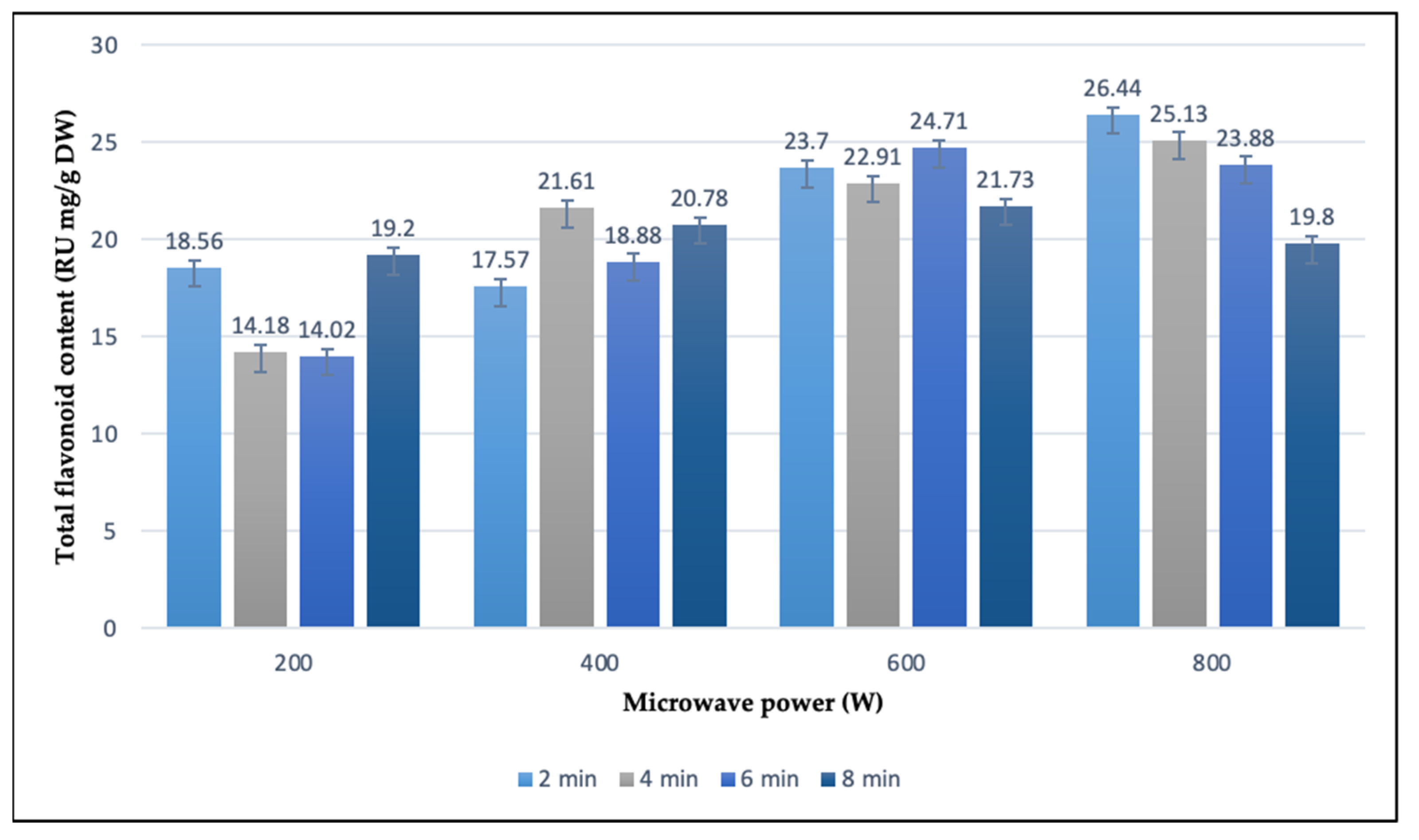 S. dumetorum extracts demonstrated noticeable variation depending on the extraction settings, ranging from 14.02 to 26.44 mg RuE/g DW. When extractions were carried out at 200 W, TFC values spanned from 14.02 to 19.20 mg RuE/g DW. The lowest concentration was obtained after a 6-min extraction, whereas the highest was reached after 8 min. At 400 W, flavonoid levels rose modestly, fluctuating between 15.51 and 21.61 mg RuE/g DW. The peak in this group occurred with 4 min of extraction, while the minimum was observed following a longer duration of 6 min. A further increase in microwave power to 600 W resulted in a slightly narrower TFC range, from 21.73 to 24.71 mg RuE/g DW. The highest yield at this level was associated with 6 min, while the lowest value corresponded to the most prolonged extraction of 8 min. In contrast, experiments conducted at 800 W showed the broadest spread in TFC values among all groups, ranging from 19.80 to 26.44 mg RuE/g DW. Notably, the maximum flavonoid content, 26.44 mg RuE/g DW, was obtained in just 2 min, suggesting that short exposure was particularly effective. On the other hand, the least favorable outcome within this group, 19.80 mg RuE/g DW, resulted from the longest extraction of 8 min.
