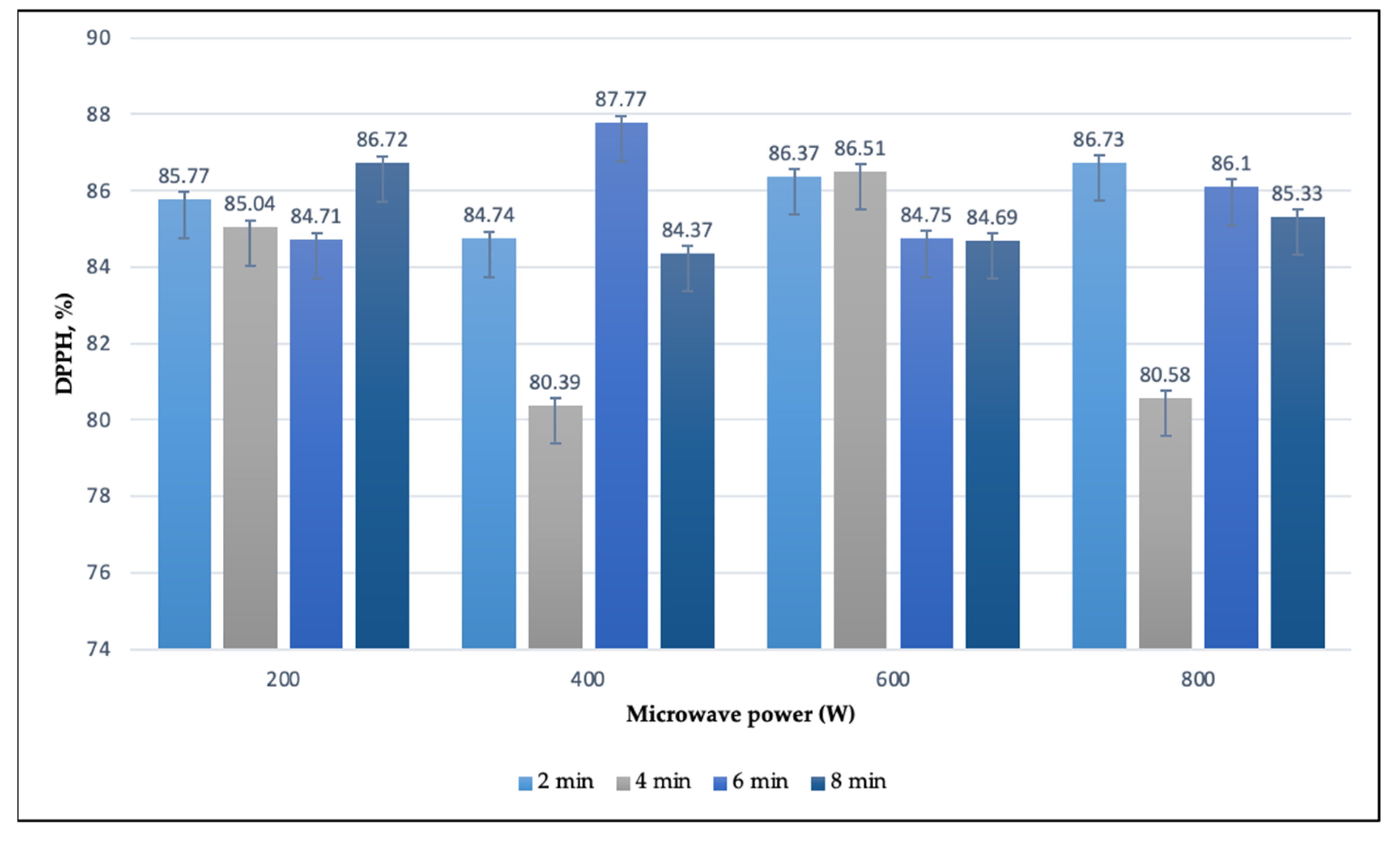 S. dumetorum leaf extracts, as measured by DPPH radical scavenging capacity. Across all microwave-assisted extraction conditions, values ranged from 79.81% to 87.77%, reflecting a generally high level of activity throughout. Under a microwave power of 200 W, antioxidant potential remained consistently strong, with DPPH values between 84.71% and 85.77%. The most active extract in this group was obtained following 2 min, while the lowest inhibition was recorded after 6 min. At 400 W, the antioxidant profile remained comparably high, spanning from 80.39% to 84.74%. Peak activity was noted after 6 min, indicating the efficiency of moderate extraction time. In contrast, the extract with the lowest DPPH value at this power level resulted from 4 min of extraction. When the extraction was performed using 600 W, results ranged from 84.69% to 86.51%, with the highest antioxidant capacity observed after 4 min. Interestingly, values in this group showed less fluctuation, suggesting that this power level may provide more stable antioxidant yields across conditions. For the 800 W extractions, DPPH values reached between 80.58% and 86.85%. The most potent antioxidant response occurred with 6 min, while the lowest was found at 4 min. Despite the higher power, antioxidant levels remained within a favorable range. Among all tested conditions, the highest overall DPPH radical scavenging activity, 87.77%, was achieved under 400 W following 6 min of extraction, underscoring the effectiveness of balanced extraction duration in preserving antioxidant properties.