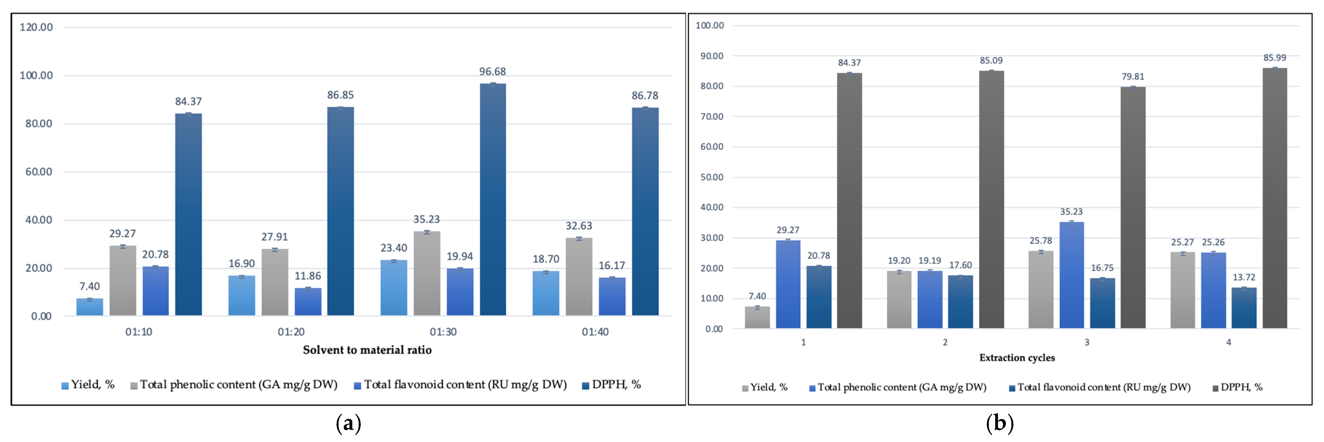 Figure 5). The highest yield 23.40% was achieved at a ratio of 1:30, followed by 18.70% at 1:40, and the lowest yield 16.90% observed at 1:20. Correspondingly, TPC varied between 27.91 and 35.23 mg GAE/g DW, with the maximum value obtained at the 1:30 ratio. TFC ranged from 11.86 to 19.94 mg RuE/g DW, and antioxidant activity, as measured by DPPH radical scavenging capacity, exhibited values between 86.78% and 96.68%, with the highest activity also recorded at the 1:30 ratio.