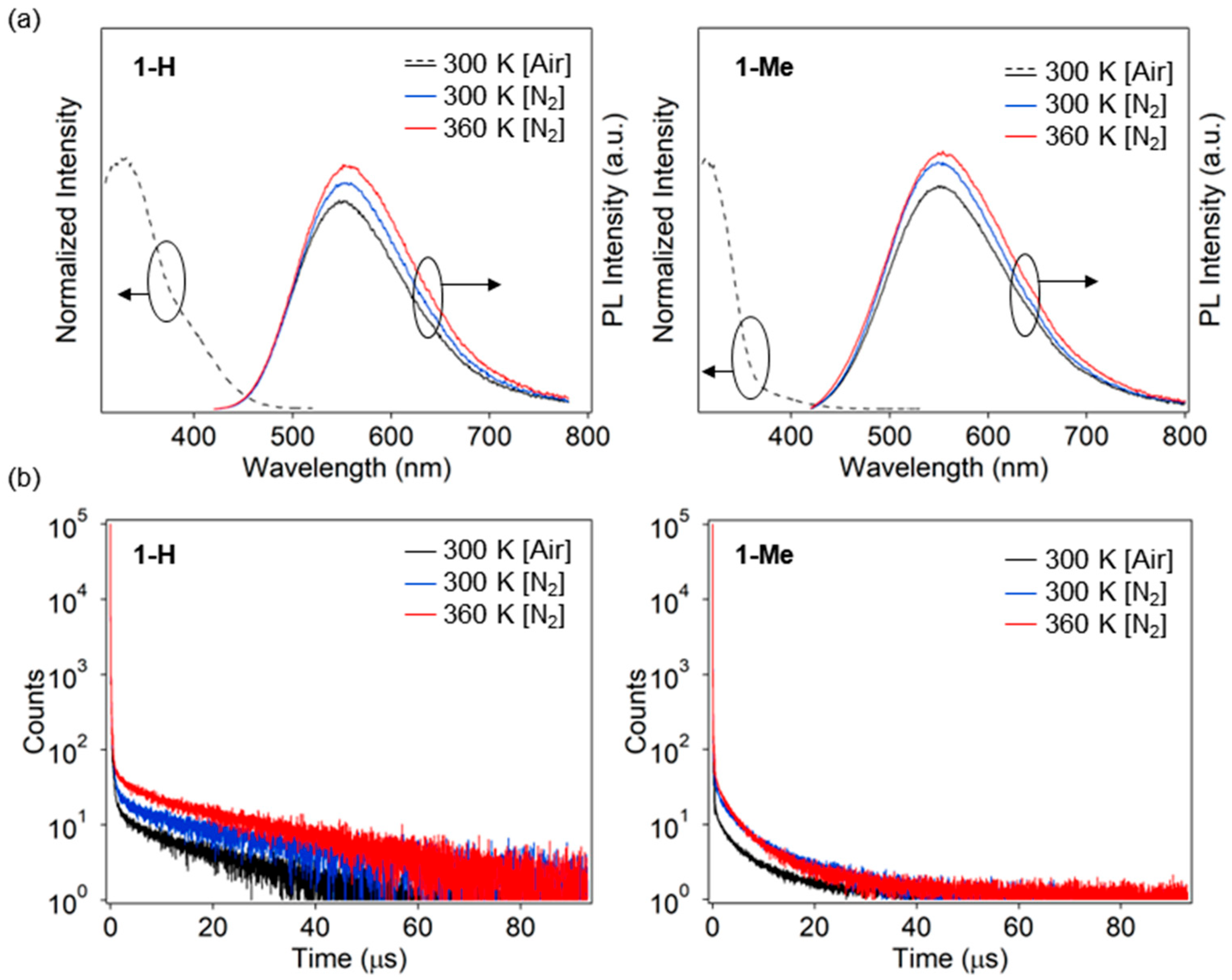 | 1-H | 300 K, Air | 326, 403 1 | 547 | 0.38 | (0.39, 0.50) | 16 [79.5] | 180 [8.0] | 2.0 [1.0] | 21 [11.5] | - | - |