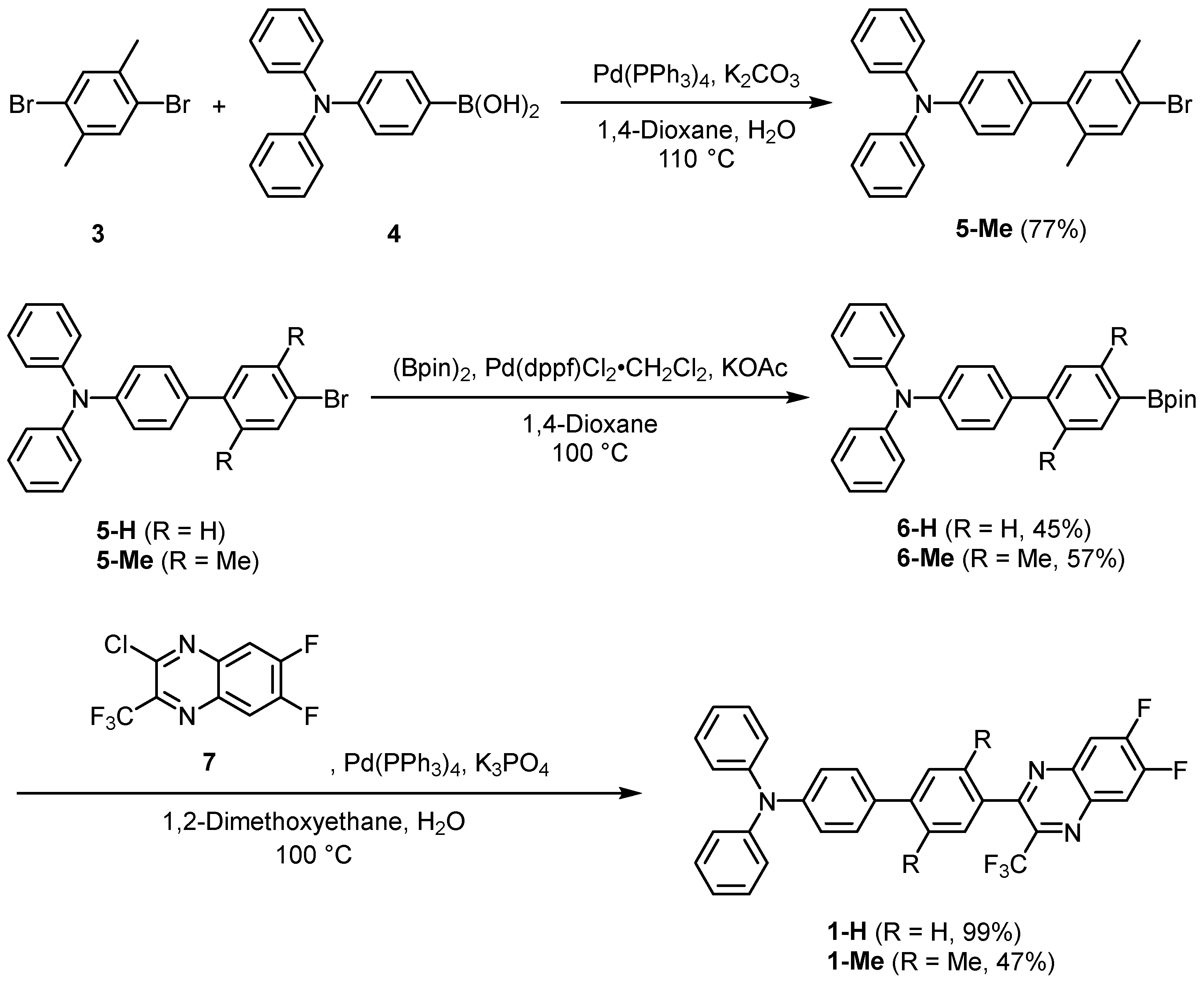 - 4′-(6,7-Difluoro-3-(trifluoromethyl)quinoxalin-2-yl)-2′,5′-Dimethyl-N,N-diphenyl-[1,1′-biphenyl]-4-amine (1-Me)