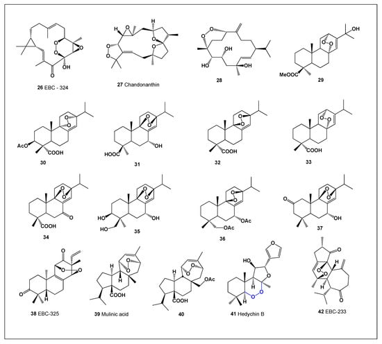 Abietic acid–derived endoperoxides (28–31) have been reported from several plant species, including Abies marocana, Elodea canadensis, Lepechinia caulescens, and Caryopteris nepetaefolia (a representative specimen is shown in Figure 5) [41,42,43,44,45,46]. Two closely related abietane-type endoperoxides, compounds 32 and 33, were isolated as acetate derivatives from the cones of Cedrus atlantica [47]. Croton laevigatus yielded crotolaevigatone G (34), while Croton insularis was the source of two additional endoperoxide-containing metabolites, EBC-325 (35) and EBC-233 (42) [48,49]. Furthermore, two diterpenoid acids, mulinic acid (36) and isomulinic acid (37), were isolated from Mulinum crassifolium [50].