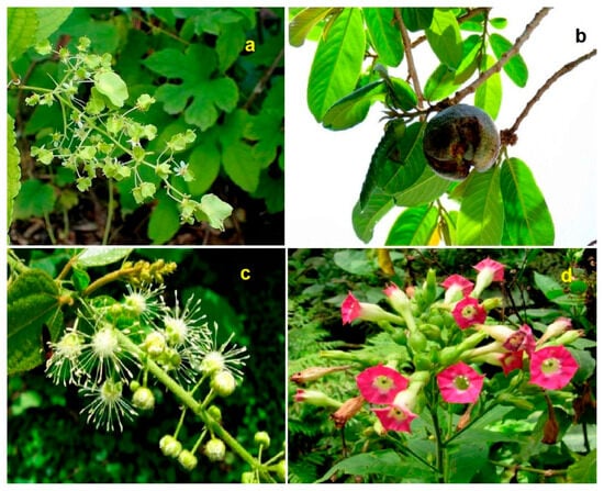 Representative plant sources of naturally occurring endoperoxides. (a) Tripterygium wilfordii (thunder god vine), a perennial vine used in traditional Chinese medicine, rich in bioactive diterpenoids and triterpenoids with immunosuppressive, anti-inflammatory, and antitumor activities, though associated with notable toxicity. (b) Zuelania guidonia (syn. Casearia laetioides), a shrub or small tree native to the Caribbean and Central America, traditionally used medicinally and as food, and known to produce peroxide-containing terpenoids. (c) Croton caudatus, widely used in Southeast Asian ethnomedicine for liver, febrile, and inflammatory disorders; its extracts show cytotoxic activity against cancer cell lines. (d) Nicotiana tabacum, a globally cultivated Solanaceae species with historical medicinal uses; its leaves contain alkaloids and terpenoids applied in traditional treatments for inflammatory and dermatological conditions.