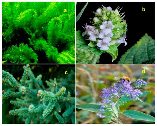 Additional plant sources of naturally occurring endoperoxides. (a) Elodea canadensis, a submerged freshwater plant native to North America, inhabits slow-moving waters and exhibits strong allelopathic activity through the release of bioactive secondary metabolites. (b) Lepechinia caulescens, an aromatic perennial native to the Americas and Hawaii, produces essential oils with pronounced antibacterial activity, including bactericidal effects against Vibrio cholerae. (c) Abies marocana, a critically endangered conifer endemic to the Atlas Mountains of Morocco, yields seed and needle extracts traditionally used for respiratory ailments and in perfumery. (d) Caryopteris nepetaefolia, an East Asian Lamiaceae species valued ornamentally, is rich in terpene-based volatile metabolites responsible for its eucalyptus-like aroma.