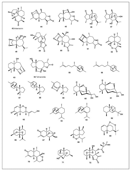 Artemisinin (43; structure shown in Figure 6, biological activity summarized in Table 3, and 3D representation presented in Figure 7) is a natural metabolite and represents the fastest-acting drug currently available for the treatment of tropical malaria caused by Plasmodium falciparum. In 1971, Chinese researchers isolated the compound responsible for the antimalarial activity of Artemisia annua leaves. This substance, originally termed qinghaosu (QHS) and later named artemisinin, is a sesquiterpene lactone containing a unique endoperoxide moiety. Notably, unlike most conventional antimalarial agents, artemisinin lacks a nitrogen-containing heterocyclic ring system [11,52,53].