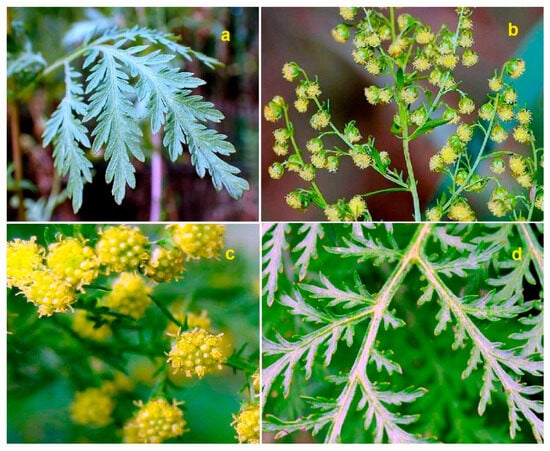 Artemisia annua (annual wormwood, sweet wormwood, annual mugwort, or one-year sagebrush) is a widespread species native to temperate regions of Asia and now naturalized in many parts of the world, including North America. Despite its common occurrence along roadsides and in disturbed habitats, A. annua is the natural source of artemisinin, a sesquiterpene endoperoxide of exceptional biomedical importance. (a,d) Leaves of A. annua; (b,c) inflorescences of A. annua.