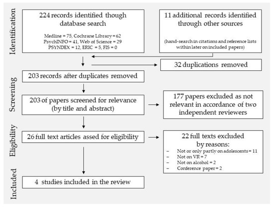 The Database search retrieved 224 records. Most of the records were found in MEDLINE (n = 75), Cochrane Library (n = 62), and PsychINFO (n = 41). The search in Web of Science, PSYNDEX, and ERIC resulted in 29, 12, and 5 results, respectively. No suitable study was identified in the German database FIS. Hand search resulted in 11 additional publications. After duplicates were removed, 203 records were screened by reading titles and abstracts. Subsequently, 177 papers were excluded. Of the remaining 26 records, 22 were excluded due to the following reasons: Eleven studies were not dealing with the specified target group, seven records did not deal with VR as an intervention, two studies were not focusing on alcohol use and two studies did not provide a full text. Consequently, four records were included in the synthesis. The search process is visualized in Figure 1.