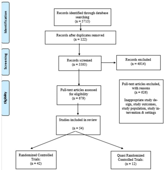The search strategy identified 5715 articles. After removing 122 duplicates, 5593 were screened on title abstracts and 679 were retrieved for full texts. Based on the final inclusion criteria, 54 articles were included in our systematic review. Studies excluded after full-text screening are mentioned in the PRISMA flow diagram (Figure 1). Of the 54 included studies, 12 were quasi-RCTs and 42 were RCTs. Three studies were entirely conducted on young people aged 10–24 (n = 5929), whereas the remaining 51 studies were conducted either with adolescents aged 10–19 (n = 69,553) or youth aged 15–24 (n = 19,348). Regarding geographical distribution, 38 studies were conducted in Africa [24,33,34,35,36,37,38,39,40,41,42,43,44,45,46,47,48,49,50,51,52,53,54,55,56,57,58,59,60,61,62,63,64,65,66,67,68,69], 9 in Asia [70,71,72,73,74,75,76,77,78], and 7 in North America (the Caribbean) [79,80,81,82,83,84,85]. Of the 54 studies, 39 were meta-analyzed; however, 15 could not be pooled because either they did not report the outcome of interest or reported it differently. Table 1 presents the characteristics of the studies. The methodological qualities are provided in Figure 2. Studies were not excluded based on assessment scores as the purpose was to examine and gain insight into the rigor of existing research. (Table 2 presents the findings from the meta-analysis discussed in the sections below).