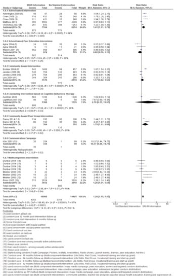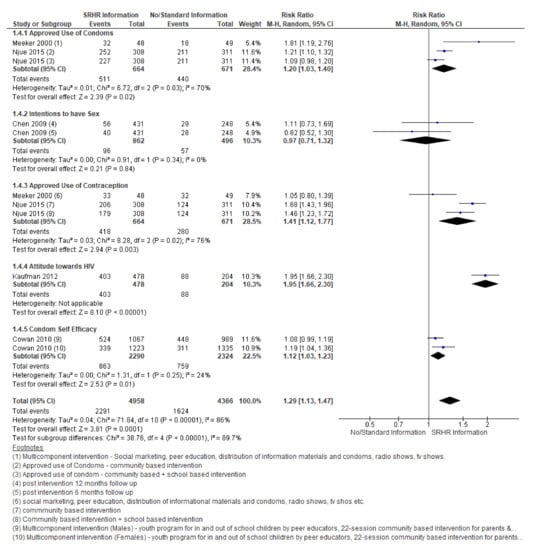 Subgroup analysis based on the type of ASRHR educational interventions revealed that sports-based interventions in schools, community-based peer-group interventions, and multicomponent interventions were effective in improving knowledge of ASRHR (Figure 4). The multicomponent interventions included a range of interventions that aimed to increase ASRHR knowledge to adolescents via mass media campaigns, peer education, and targeted condom distribution in communities. Whereas interventions including counseling based on cognitive behavioral therapy, school-based programs, and communication campaign interventions were effective in improving the use ASRHR services, contraceptive methods, and condom use. The communication campaign incorporated various wide-distribution strategies to reach out to different audiences and reinforce ASRHR messages: posters in the community with key messages around sexual responsibility, peer pressure, AIDS, drugs, and alcohol; five different leaflets on saying “no” to sex, postponing sex, delaying parenthood, and STIs; newsletters by peer educators and schools on reproductive health issues. The campaign also entailed peer education, the launch and implementation of radio campaigns, community theatre and events, and a hotline to provide ASRHR support (Table 2).