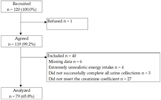 In the present study, 120 Japanese adolescent football players met the inclusion criteria, of which 119 (99.2%) provided written informed consent (Figure 1). In total, 40 participants were excluded from the analyses (6 missing data, 4 extremely unrealistic energy intake, 3 did not complete all urine collections, and 27 did not meet the CC criteria) [21]. Thus, data from 79 participants (65.8%) were analyzed.
