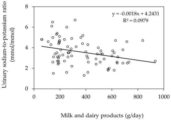 In our study, milk and dairy products showed an independent association with urinary potassium. Association between milk and dairy products and the urinary Na/K ratio is depicted in Figure 2. According to previous studies identifying major sources of potassium, Grimes et al. [8] reported that the major sources of potassium were milk and dairy products (11.5%) in Australian adolescents. Carla et al. [31] reported that, for potassium intake, the main sources were milk and milk products (21%) in Portuguese adolescents. Ballew et al. [34] reported that the single most substantial dietary source of potassium was milk and dairy products (22%) among children and adolescents in the United States. Thus, the results of the present study support previous studies that potassium intake is associated with milk and dairy products [8,31]. On the other hand, our results were different from Okuda et al. [6], who reported that the urinary Na/K ratio was associated with the intake of fruits in Japanese adolescents. Our results may reflect the low proportion of adolescent football players who follow the recommendation to eat at least 350 g vegetables and 200 g fruit and daily (32% and 33%, respectively; data not shown) [35].