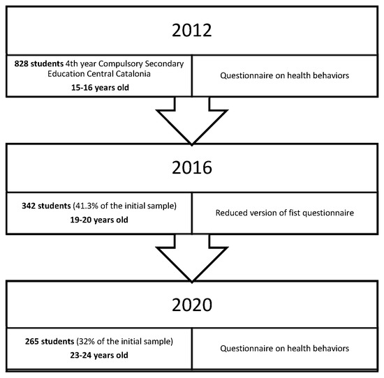 Participants that consented to follow-up were contacted again in 2016 (19–20 years), of which 342 participants (41.3%) took part. The final follow-up was conducted in 2020 (23–24 years), of which 265 students took part (32%) (Figure 1). Participants were contacted by email or telephone. They were sent the study information and gave informed consent by e-mail. The e-mail included a link to the questionnaire. If the participant didn’t accept the informed consent, they could not begin the questionnaire. We would also like to point out that, in 2016 (19–20 years old), the students who agreed to participate again were asked to use their data from 2011–2012 and agree to be followed in future studies. The data from other students who participated on 2011–2012, but who did not agree to participate, is not shown in the present study. In 2016 a specific informed consent was required. The questionnaire used in 2012 was created specifically for this study, using previously validated questionnaires on various behaviours and lifestyles. This had a response time of about 40 min. The questionnaire was administered by staff from outside the school, who provided instructions for completing it and answered possible questions. Subsequently, in 2016 and 2020, a scaled-back version of the same questionnaire was used, adapted on-line through the LimeSurvey tool (Available online: https://www.limesurvey.org/) (accessed on 1 July 2022), and self-administered.
