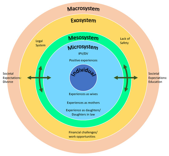 The macrosystem consists of cultural, societal, and political contexts and values that can influence a society as a whole, including the child brides. The main themes emerging in this category were experiences with societal expectations around continuing education and the ability to get a divorce.