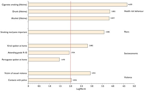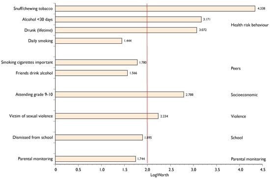 Effect sizes of p-values (LogWorth value scale) for statistically significant explanatory variables (p < 0.05) for WPS during the last 30 days, grouped by key influential factors. Multinomial logistic regression model for daily smoking (R2 = 0.458). LogWorth value above 2 corresponds to a p-value below 0.01 (red line).
