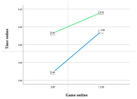The use of the Internet for games online showed a positive and significant association both with time spent online and sex (boys = 0). The interaction effect of sex and the use of games online showed a negative and significant association with time spent online. Again, simple slope analysis showed the same results as Model 3 with boys, who used more games online than girls.