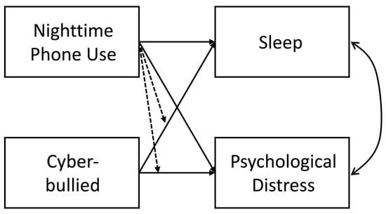 We hypothesise that nighttime phone use, or being cyberbullied, will both directly increase the odds of poor sleep and psychological distress. We further propose that the risk of poor sleep and psychological distress will be higher for victims of cyberbullying who more frequently engage in nighttime phone use. Based on the existing literature, we hypothesise that older age and female gender will be associated with more frequent reports of psychological distress, poor sleep, nighttime phone use, and cyberbullying.