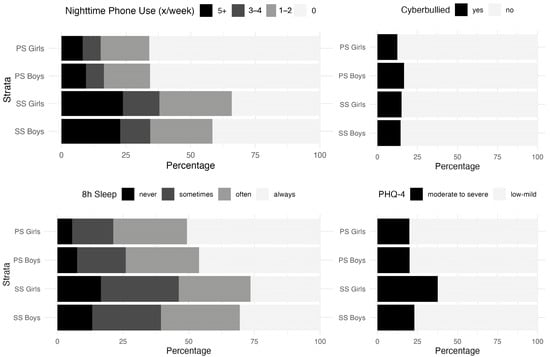 Percentage of response categories per variable. Graphs show percentage of response categories for obtaining 8 h sleep (top left panel), nighttime phone use (top right panel), psychological distress (bottom right panel), and being cyberbullied (bottom left panel) for primary- (PS) and secondary (SS)-school-aged girls and boys.