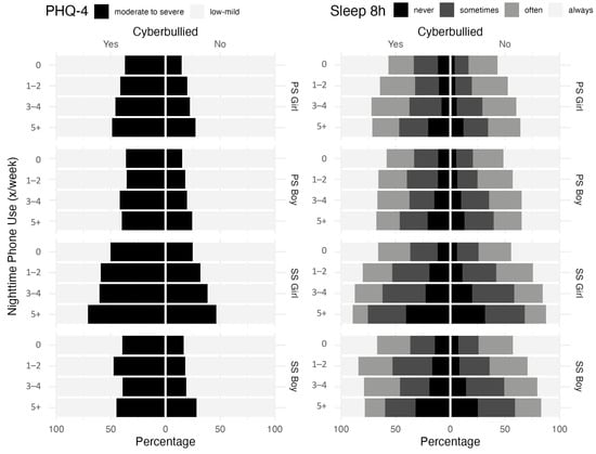 Psychological distress and obtaining 8 h sleep by nighttime texting for age and gender strata split by whether respondents reported being cyberbullied. Pyramid plots in the left panel show psychological distress (mild–normal/mod–severe), and plots in the right panel show obtaining 8 h sleep (never/sometimes/often/always). Vertical axes show nighttime texting (0/2/3–4/5+ times per week) for age group (primary (PS)/secondary (SS) school aged) and sex (girls/boys) strata. The left side of each pyramid shows participants who reported that they were not cyberbullied, and the right side shows those who reported that they experienced cyberbullying.