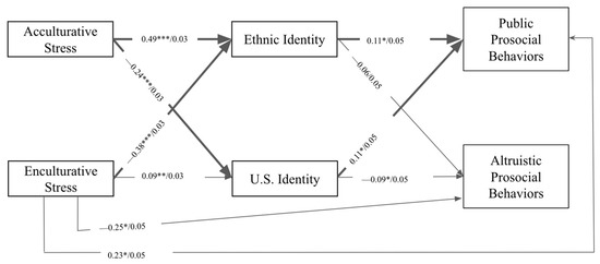 Enculturative stress demonstrated a direct, negative association with altruistic prosocial behavior (b = −0.25, p < 0) and a positive association with public prosocial behavior (b = 0.23, p < 0.001). Furthermore, enculturative stress was negatively related to ethnic identity (b = −0.38, p < 0.001) and positively related to U.S. identity (b = 0.09, p = 0.01). Ethnic identity was positively associated with public prosocial behavior (b = 0.11, p = 0.03) and was not significantly associated with altruistic behavior (b = −0.06, p = 0.25). U.S. identity was positively associated with public prosocial behavior (b = 0.11, p = 0.02) and negatively associated with altruistic behavior (b = −0.09, p = 0.05).