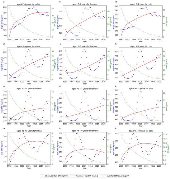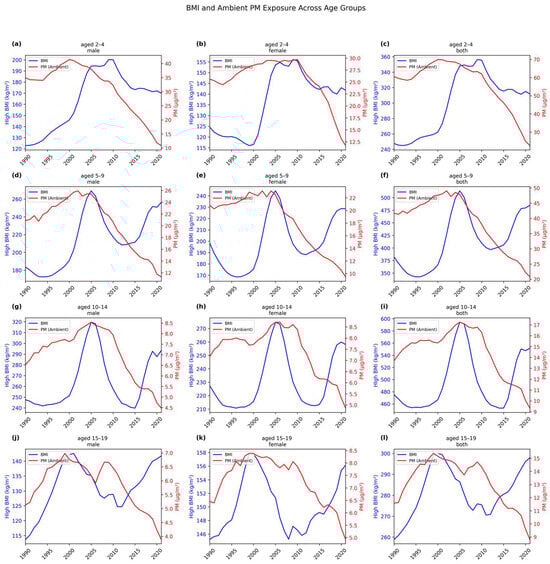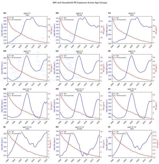 Time series of high BMI values and household PM exposure across age groups (a) aged 2–4 years for males, (b) aged 2–4 years for females, (c) aged 2–4 years for both, (d) aged 5–9 for males, (e) aged 5–9 for females, (f) aged 5–9 for both, (g) aged 10–14 for males, (h) aged 10–14 for females, (i) aged 10–14 for both, (j) aged 15–19 for males, (k) aged 15–19 for females, and (l) aged 15–19 for both.