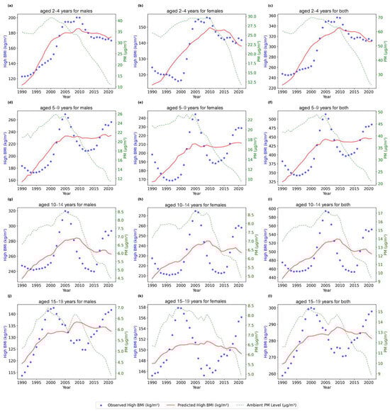 The time series analysis (Figure 1) illustrated the relationship between a high BMI and ambient PM exposure for different age and gender groups, covering the ages 2–19 from 1990 to 2021. Each sub-figure displays the high BMI trends alongside the ambient PM levels. For children aged 2–4, both males (Figure 1a) and females (Figure 1b) showed an increase in high BMI values as the ambient PM levels decreased. However, this inverse relationship was not consistent across the entire time series. Certain time intervals deviated from this pattern, suggesting that additional factors may have contributed to variations in the high BMI trends beyond PM exposure alone. Specifically, the PM levels declined from approximately 30 µg/m3 in the early 1990s to below 10 µg/m3 by 2020, while the high BMI values rose from around 125 to 170 kg/m2 for males (Figure 1a) and from 135 to 145 kg/m2 for females (Figure 1b). When analyzing both sexes combined (Figure 1c), the high BMI trends aligned with the observed decrease in PM, further suggesting an inverse relationship between PM exposure and a high BMI in this age group. In the 5–9 years age group, a similar temporal inverse relationship between PM exposure and a high BMI was observed, though it appeared more pronounced in females (Figure 1e) than in males (Figure 1d). Female high BMI values increased from around 200 to 230, while male high BMI values increased from approximately 180 to 260 over the study period. For both sexes combined (Figure 1f), the trend mirrored these observations, indicating a potentially stronger influence of ambient PM on a high BMI in females. Among children aged 10–14 years, the relationship between a high BMI and ambient PM exposure became less distinct and showed localized fluctuations. In males (Figure 1g), high BMI values fluctuated between 250 and 290 kg/m2 as the PM levels decreased from approximately 20 µg/m3 to 5 µg/m3. A similar pattern was seen in females (Figure 1h), with high BMI values ranging from 230 to 260 kg/m2. For both sexes combined (Figure 1i), the high BMI trends appeared inconsistent with the PM changes, suggesting additional factors influencing a high BMI in this age group and weakening the inverse correlation between PM exposure and a high BMI. In adolescents aged 15–19 years, a notable decline in high BMI values was observed during the years 2005–2010, followed by a subsequent increase. Male high BMI values (Figure 1j) remained relatively stable between 115 and 145 kg/m2, while female high BMI values (Figure 1k) fluctuated between 145 and 155 kg/m2. For both sexes combined (Figure 1l), the high BMI trends did not clearly align with the changes in PM exposure. While the PM levels continued to decline across the study period, the variations in high BMI values suggest localized and age-specific factors, leading to a weaker or negligible relationship in this age group.