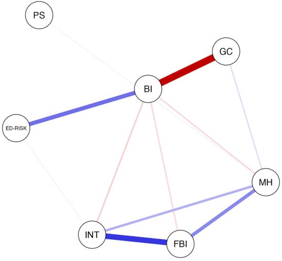 Network analysis. Note: Nodes represent the primary study variables, with edges indicating significant connections between them; thicker lines show stronger connections. Blue lines indicate positive relationships between variables, while red lines denote negative relationships. BI = aesthetic body image, FBI = functional body image, INT = interoception, MH = mental health, PS = psychosomatic symptoms, ED-RISK = eating disorders risk, GC = gender congruence.