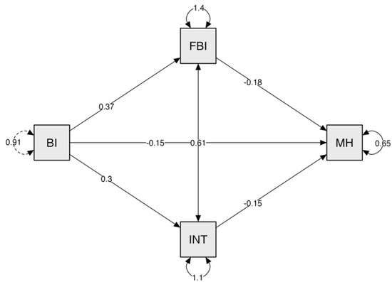 Mediation model path plot: Effects of Aesthetic Body Image (BI) on Mental Health (MH) with mediators (interoception, INT; and functional body image, FBI). Note: Figure 2 illustrates the mediation model, where aesthetic body image (BI) is the independent variable, and interoception (INT) and functional body image (FBI) act as mediators. The dependent variable in this model is general mental health (MH). Path coefficients (β), showed in the figure, are rounded to two decimal places.