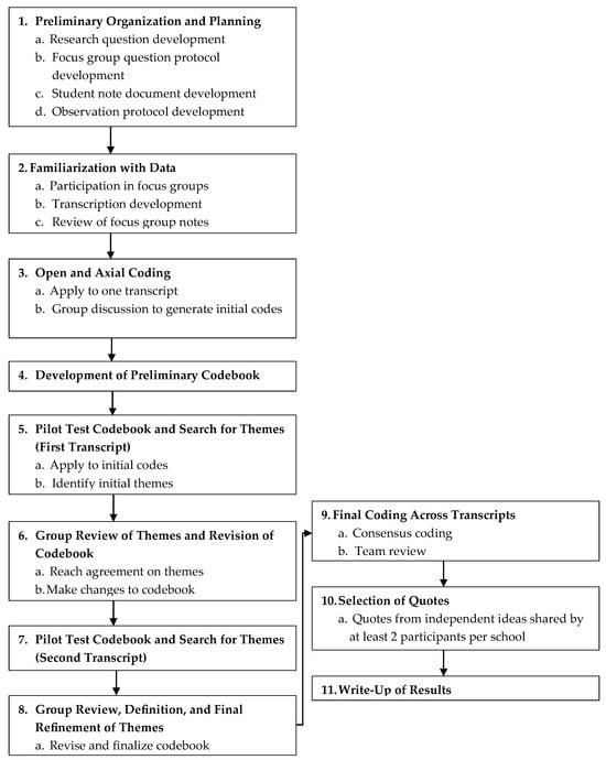 Theoretical thematic analysis was guided by data relevant to the components of ISLA or its mechanism of change selected based on the empirical literature. This approach to thematic analysis prioritizes topics of interest for researchers and highlights data answering the research questions addressed in this paper [47]. Further, we employed a realist method with the intention of reporting the experiences or the ways in which students provided meaning in relation to the research questions [47]. Steps to our analysis were informed by the work of Maguire and Delahunt [48], as well as Richards and Hemphill [49], who focused on the collaboration among team members participating in the analytical process. These steps included (a) preliminary organization and planning, (b) becoming familiar with the data through participation, transcription development, and review of focus group notes, (c) open and axial coding of one transcript followed by group discussion to generate initial codes, (d) development of a preliminary codebook, (e) pilot test codebook and search for themes in the same first transcript, (f) group review of themes, agreement, and changes to codebook, (g) pilot test codebook and search for themes in the second transcript, (h) group review, definition, or final refinement of themes in the second transcript, and (i) final coding process across transcripts with consensus coding and review by team (see Figure 1). After each stage—open and axial coding, piloting the codebook with the first and second transcript, and consensus coding across transcripts—the team convened to discuss coding decisions, agreements, and disagreements. These meetings informed iterative revisions to the codebook and subsequent coding rounds. In total, the team met seven times to ensure reliability and consistency in the coding process. As each school context and implementation process may differ, quotes were selected from independent ideas shared by at least two participants within school settings. The product of this process is written up in the Results section of this paper. Through iterative coding and team discussions, key themes were identified, refined, and aligned with the research questions. These themes serve as the foundation of the Results section, where we present both the positive and negative aspects of students’ experiences to provide a comprehensive understanding of the data.